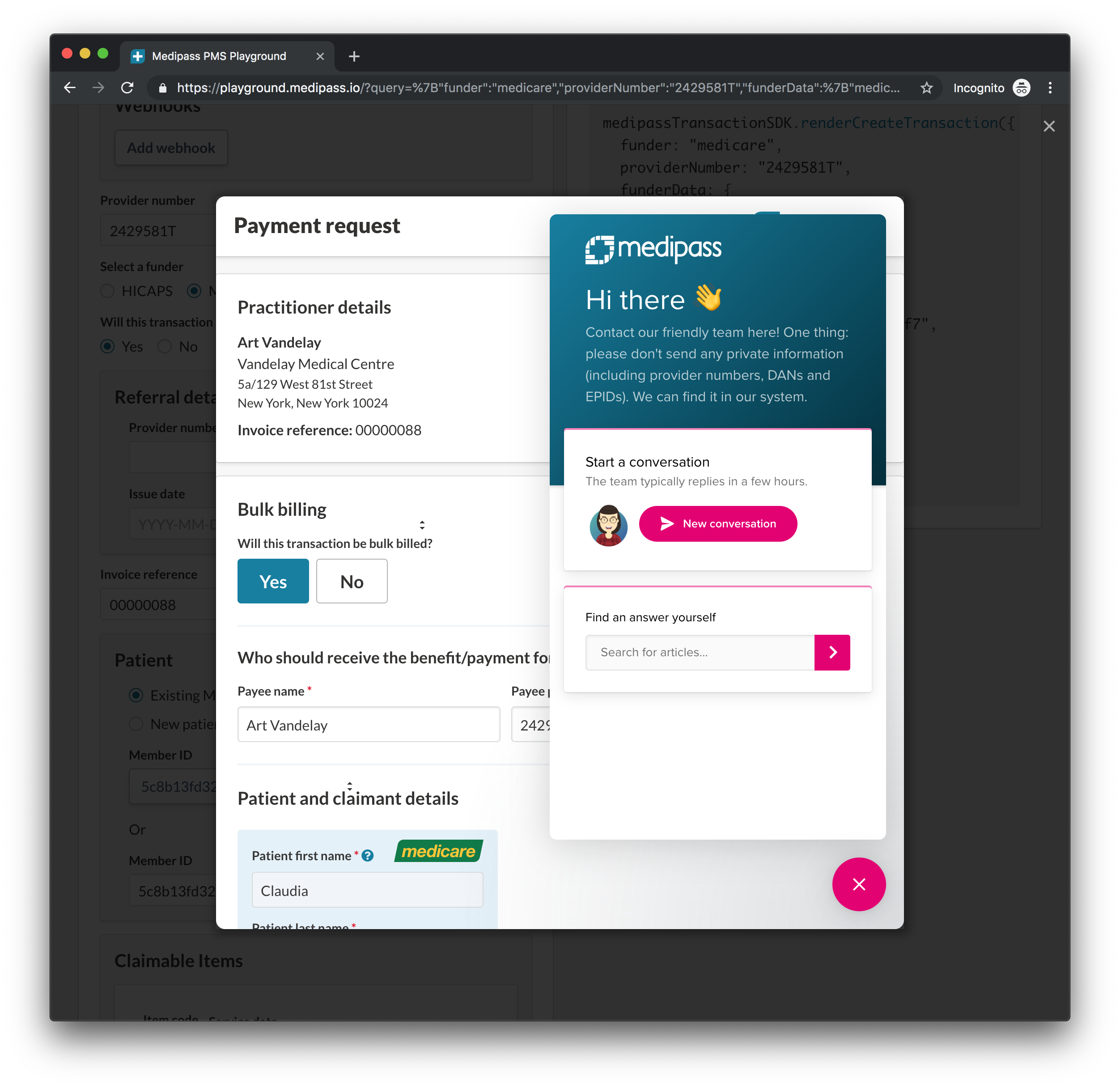 ``` > Note: You can style the container HTML element however you like. **In your JS:** ```js sdk.renderCreateTransaction({ // your payload }, { containerId: 'medipass-container' }) ``` With these two snippets implemented, you should be able to get an embedded Medipass frame working. ## Disable modification of service items To prevent providers from changing item details in the Tyro Health interface on error, set `disableModifyServiceItems` to true in the SDK options. This option is used by some practice management systems to maintain referential integrity on problematic transactions. ```Js sdk.renderCreateTransaction({ // your payload }, { disableModifyServiceItems: true }) ``` ## Disable edit To prevent providers from changing details other details in the Tyro Health interface on error, we have a flag called `allowEdit`. When this flag is set to false it will make everything read-only. ```Js sdk.renderCreateTransaction({ // your payload }, { allowEdit: false }) ``` ## Provider support and help desk The Transaction SDK includes a link and live chat support module for provider inquiries. Providers can initiate a contextual help session right from the self-contained UI. We also provide links to online help articles and videos for all claiming and payment scenarios. The support module links to our help system which identifies the business and status of transactions, including recently errored claims. This means that claim and payment transaction issues and inquiries can be easily directed to us rather than your help desk. The support module can be invoked anytime by clicking on the chat & help link. You can provide a link to our support module in your support system for “ticket escalation” and other inquiries that require our attention. You can choose to hide the Tyro Health Online live chat and support module by setting the parameter `hideChatBubble`. Only enable this option if you prefer for end user transaction queries to be directed to your help desk.  ### Disabling the help desk If you'd rather handle the support on your platform, you can disable the help desk by: ```js medipassTransactionSDK.renderCreateTransaction({ ... }, { hideChatBubble: true }) ```